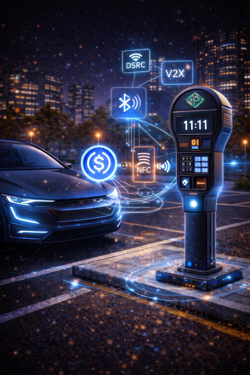 Vehicles communicate directly with parking infrastructure to authorize and settle payments automatically.